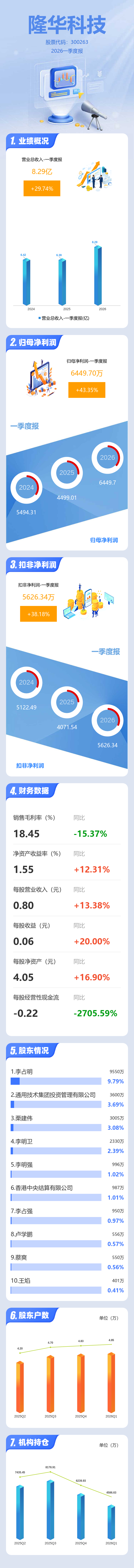 证券之星消息,隆华科技2026年一季报显示,一季度公司主营收入8.29亿元,同比上升29.74%;归母净利润6449.7万元,同比上升43.36%;扣非净利润5626.34万元,同比上升38.19%;负债率40.94%,投资收益-114.33万元,财务费用218.57万元,毛利率18.45%。