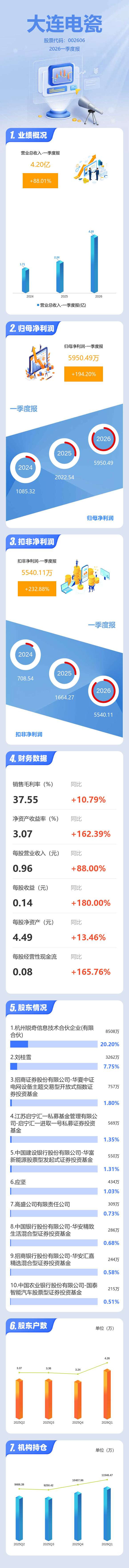 证券之星消息,大连电瓷2026年一季报显示,一季度公司主营收入4.2亿元,同比上升88.01%;归母净利润5950.49万元,同比上升194.21%;扣非净利润5540.11万元,同比上升232.89%;负债率36.96%,投资收益96.61万元,财务费用876.83万元,毛利率37.55%。