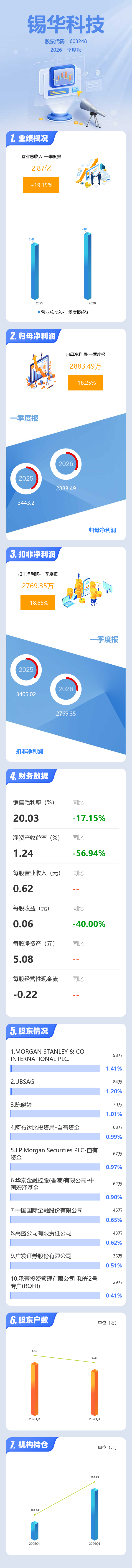 证券之星消息,锡华科技2026年一季报显示,一季度公司主营收入2.87亿元,同比上升19.15%;归母净利润2883.49万元,同比下降16.26%;扣非净利润2769.35万元,同比下降18.67%;负债率20.13%,投资收益5.5万元,财务费用273.72万元,毛利率20.03%。