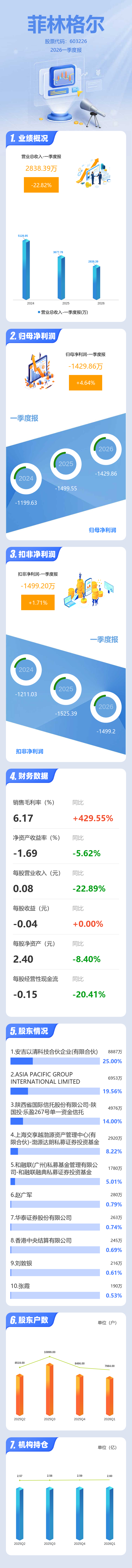 证券之星消息,菲林格尔2026年一季报显示,一季度公司主营收入2838.39万元,同比下降22.82%;归母净利润-1429.86万元,同比上升4.65%;扣非净利润-1499.2万元,同比上升1.72%;负债率25.6%,投资收益5.09万元,财务费用-29.0万元,毛利率6.17%。
