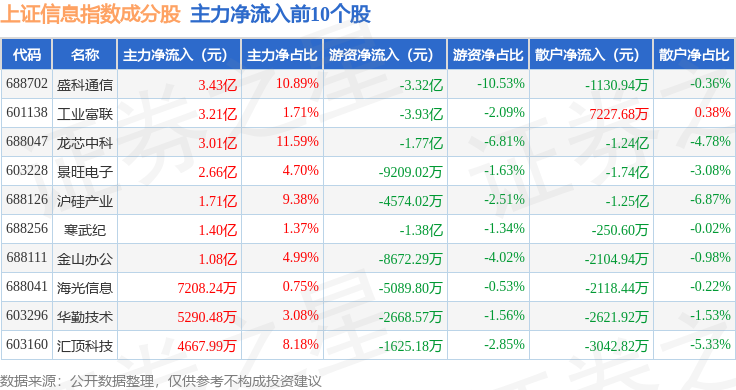 资金流向方面,上证信息(000039)指数成份股当日主力资金净流出合计45.94亿元,游资资金净流入合计22.16亿元,散户资金净流入合计23.79亿元。成份股资金流向详情见下表: