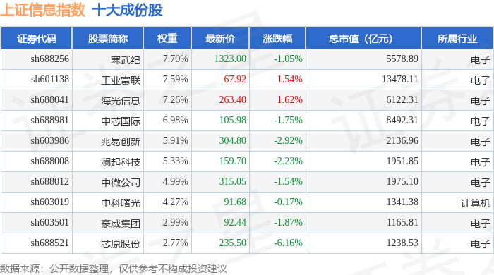 证券之星消息,4月23日,上证信息(000039)指数报收于5943.16点,跌1.05%,成交1591.55亿元,换手率2.53%。当日该指数成份股中,上涨的有12家,盛科通信以12.37%的涨幅领涨,下跌的有38家,环旭电子以6.73%的跌幅领跌。