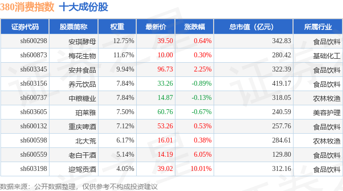 证券之星消息,4月23日,380消费(000108)指数报收于12350.59点,涨1.31%,成交56.02亿元,换手率1.61%。当日该指数成份股中,上涨的有15家,迎驾贡酒以10.01%的涨幅领涨,下跌的有3家,养元饮品以0.89%的跌幅领跌。