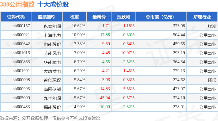 380公用(000113)指数十大成份股详情如下: