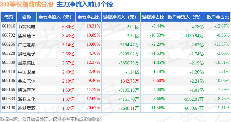 资金流向方面,380等权(000115)指数成份股当日主力资金净流出合计108.71亿元,游资资金净流入合计45.38亿元,散户资金净流入合计63.33亿元。成份股资金流向详情见下表: