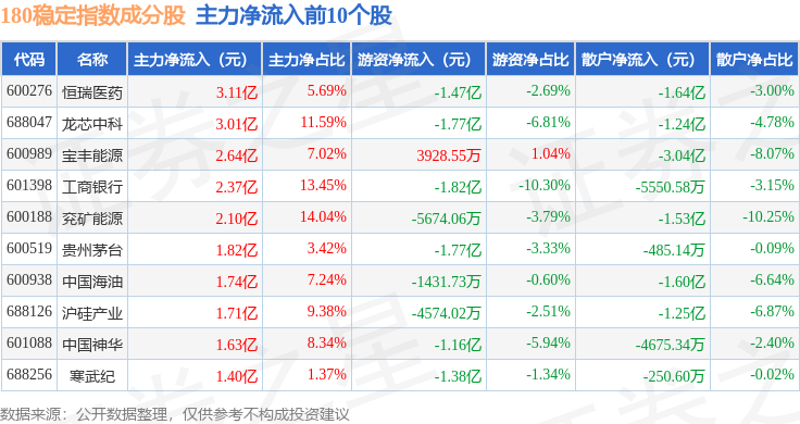 资金流向方面,180稳定(000125)指数成份股当日主力资金净流出合计4.13亿元,游资资金净流出合计2.32亿元,散户资金净流入合计6.45亿元。成份股资金流向详情见下表: