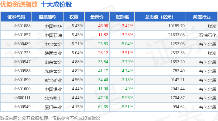 优势资源(000145)指数十大成份股详情如下: