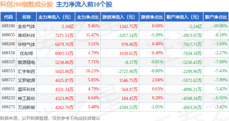 资金流向方面,科创200(000699)指数成份股当日主力资金净流出合计36.91亿元,游资资金净流入合计31.59亿元,散户资金净流入合计5.31亿元。成份股资金流向详情见下表: