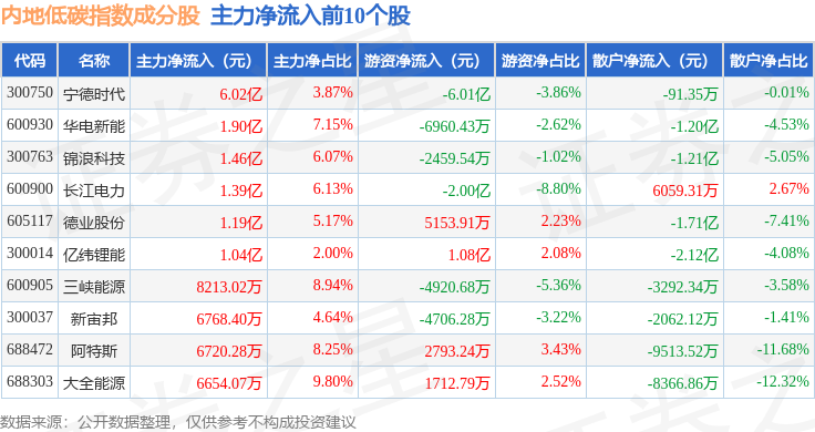 资金流向方面,内地低碳(000977)指数成份股当日主力资金净流出合计51.29亿元,游资资金净流入合计12.69亿元,散户资金净流入合计38.32亿元。成份股资金流向详情见下表: