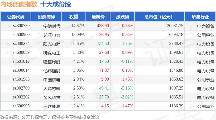 证券之星消息,4月23日,内地低碳(000977)指数报收于2254.16点,跌0.73%,成交1061.29亿元,换手率1.36%。当日该指数成份股中,上涨的有18家,南网储能以5.55%的涨幅领涨,下跌的有30家,罗博特科以7.25%的跌幅领跌。