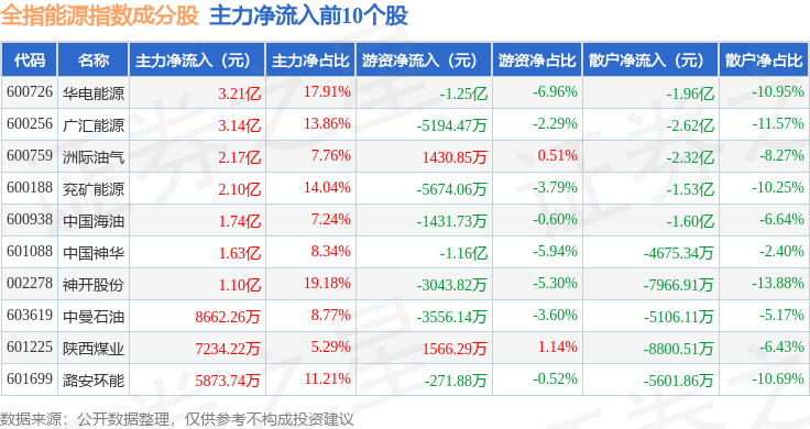 资金流向方面,全指能源(000986)指数成份股当日主力资金净流入合计19.51亿元,游资资金净流出合计3.18亿元,散户资金净流出合计16.33亿元。成份股资金流向详情见下表: