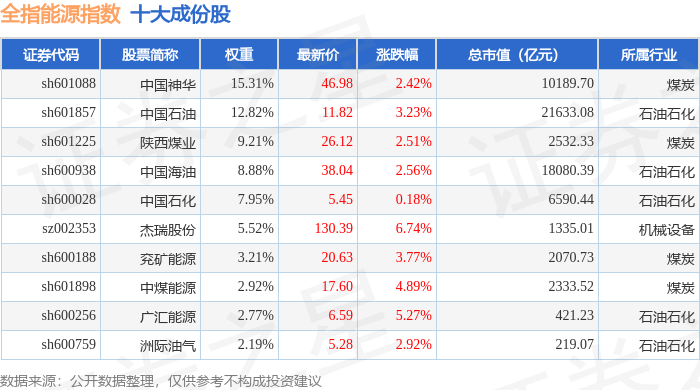 全指能源(000986)指数十大成份股详情如下: