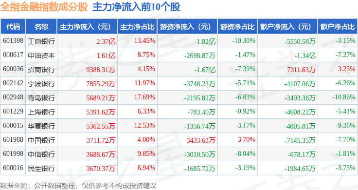 资金流向方面,全指金融(000992)指数成份股当日主力资金净流出合计32.93亿元,游资资金净流入合计5.93亿元,散户资金净流入合计27.01亿元。成份股资金流向详情见下表: