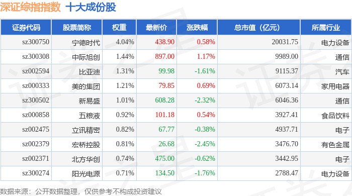 深证综指(399106)指数十大成份股详情如下: