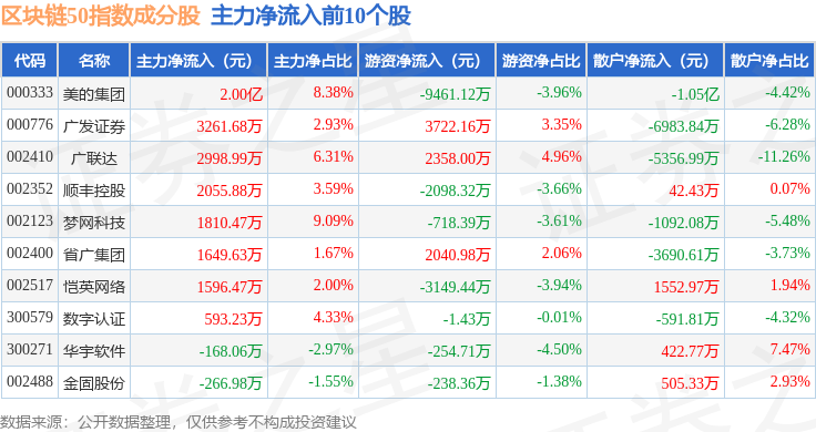 资金流向方面,区块链50(399286)指数成份股当日主力资金净流出合计32.66亿元,游资资金净流入合计9.19亿元,散户资金净流入合计23.46亿元。成份股资金流向详情见下表: