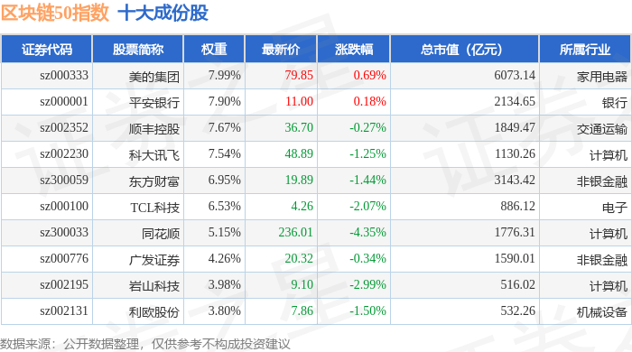 区块链50(399286)指数十大成份股详情如下: