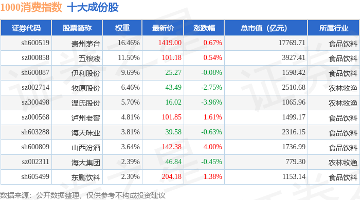 证券之星消息,4月23日,1000消费(399385)指数报收于8754.99点,涨0.23%,成交315.65亿元,换手率1.4%。当日该指数成份股中,上涨的有34家,迎驾贡酒以10.01%的涨幅领涨,下跌的有17家,温氏股份以3.96%的跌幅领跌。