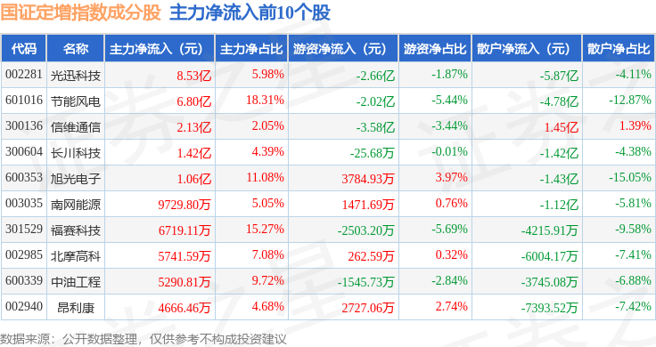 资金流向方面,国证定增(399428)指数成份股当日主力资金净流出合计45.88亿元,游资资金净流入合计22.63亿元,散户资金净流入合计23.25亿元。成份股资金流向详情见下表: