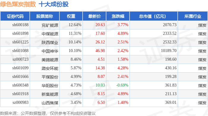 绿色煤炭(399436)指数十大成份股详情如下: