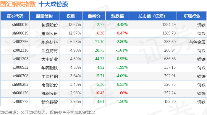 国证钢铁(399440)指数十大成份股详情如下: