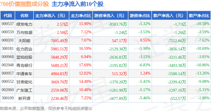 资金流向方面,700价值(399629)指数成份股当日主力资金净流出合计43.8亿元,游资资金净流入合计3.59亿元,散户资金净流入合计40.21亿元。成份股资金流向详情见下表: