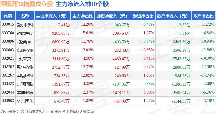 资金流向方面,深医药50(399647)指数成份股当日主力资金净流出合计6.99亿元,游资资金净流入合计4.18亿元,散户资金净流入合计2.82亿元。成份股资金流向详情见下表: