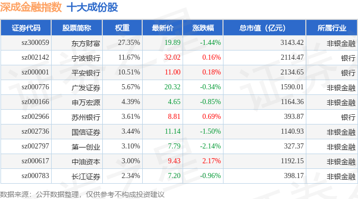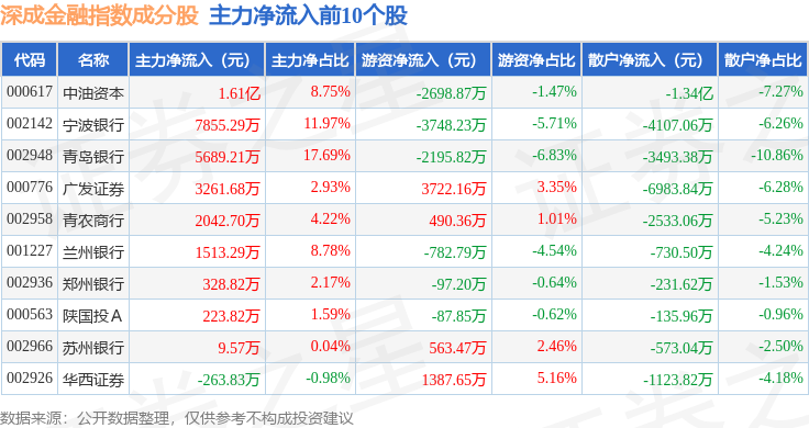资金流向方面,深成金融(399686)指数成份股当日主力资金净流出合计10.54亿元,游资资金净流入合计2.86亿元,散户资金净流入合计7.68亿元。成份股资金流向详情见下表:
