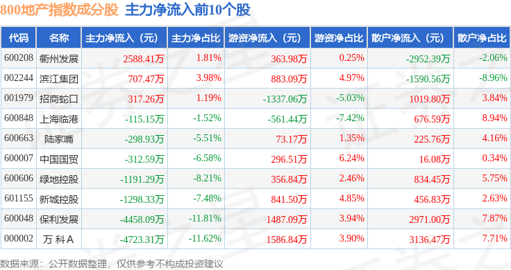 资金流向方面,800地产(399965)指数成份股当日主力资金净流出合计1.37亿元,游资资金净流入合计5064.38万元,散户资金净流入合计8639.81万元。成份股资金流向详情见下表: