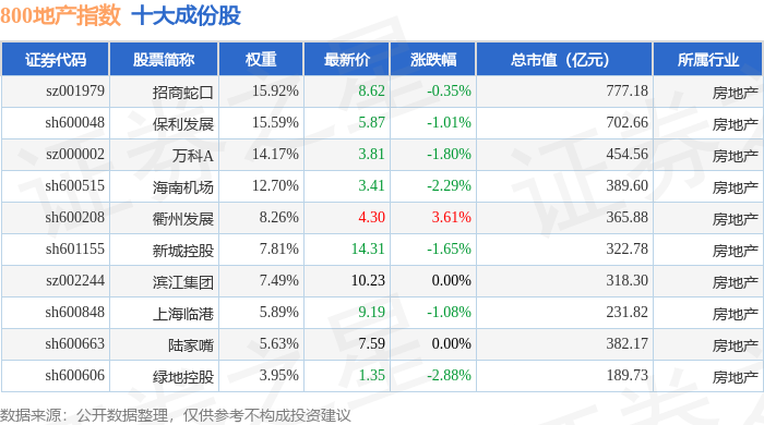 800地产(399965)指数十大成份股详情如下: