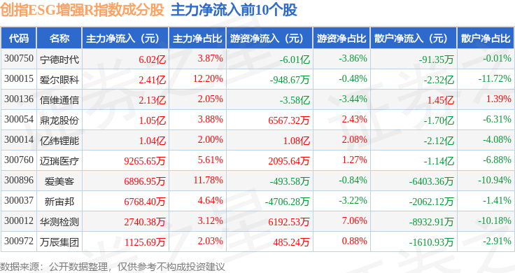 资金流向方面,创指ESG增强R(470034)指数成份股当日主力资金净流出合计105.97亿元,游资资金净流入合计42.29亿元,散户资金净流入合计63.67亿元。成份股资金流向详情见下表: