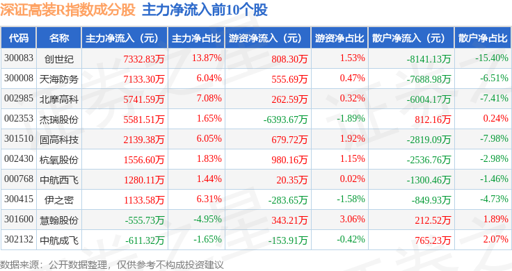 资金流向方面,深证高装R(470037)指数成份股当日主力资金净流出合计74.69亿元,游资资金净流入合计23.23亿元,散户资金净流入合计51.46亿元。成份股资金流向详情见下表:
