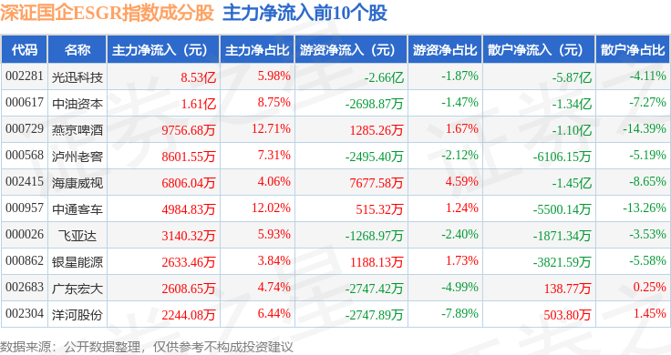 资金流向方面,深证国企ESGR(470055)指数成份股当日主力资金净流出合计11.32亿元,游资资金净流入合计4.17亿元,散户资金净流入合计7.15亿元。成份股资金流向详情见下表: