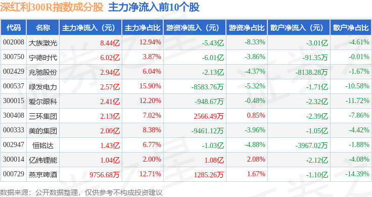 资金流向方面,深红利300R(470062)指数成份股当日主力资金净流出合计140.54亿元,游资资金净流入合计28.52亿元,散户资金净流入合计112.02亿元。成份股资金流向详情见下表: