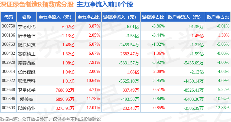 资金流向方面,深证绿色制造R(470069)指数成份股当日主力资金净流出合计77.41亿元,游资资金净流入合计15.63亿元,散户资金净流入合计61.78亿元。成份股资金流向详情见下表: