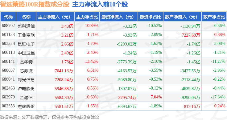资金流向方面,智选策略100R(489015)指数成份股当日主力资金净流出合计239.17亿元,游资资金净流入合计86.69亿元,散户资金净流入合计152.49亿元。成份股资金流向详情见下表: