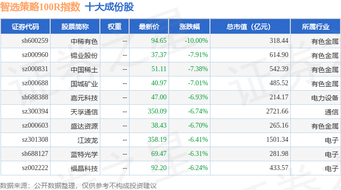 证券之星消息,4月23日,智选策略100R(489015)指数报收于5799.5点,跌2.15%,成交3704.77亿元,换手率3.67%。当日该指数成份股中,上涨的有19家,盛科通信以12.37%的涨幅领涨,下跌的有80家,中稀有色以10.0%的跌幅领跌。