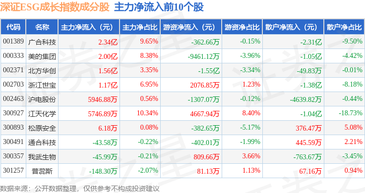 资金流向方面,深证ESG成长(970060)指数成份股当日主力资金净流出合计104.29亿元,游资资金净流入合计38.78亿元,散户资金净流入合计65.51亿元。成份股资金流向详情见下表: