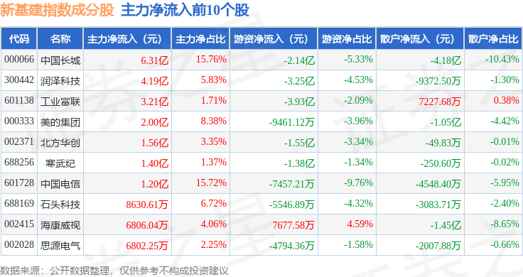 资金流向方面,新基建(980029)指数成份股当日主力资金净流出合计64.93亿元,游资资金净流入合计28.53亿元,散户资金净流入合计36.41亿元。成份股资金流向详情见下表: