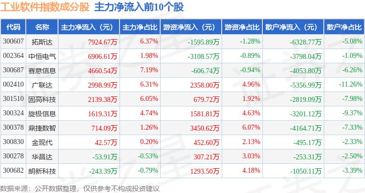 资金流向方面,工业软件(980034)指数成份股当日主力资金净流出合计24.29亿元,游资资金净流入合计10.67亿元,散户资金净流入合计13.62亿元。成份股资金流向详情见下表: