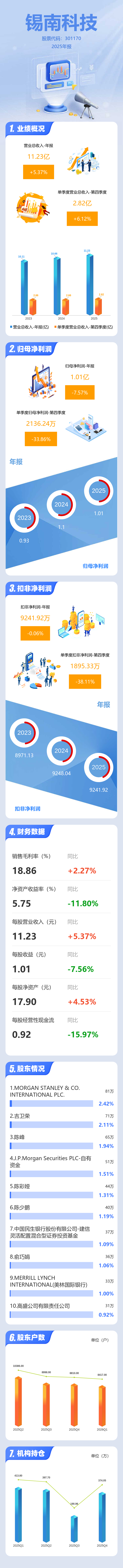 证券之星消息,锡南科技2025年年报显示,当年度公司主营收入11.23亿元,同比上升5.37%;归母净利润1.01亿元,同比下降7.58%;扣非净利润9241.92万元,同比下降0.07%;其中2025年第四季度,公司单季度主营收入2.82亿元,同比上升6.13%;单季度归母净利润2136.24万元,同比下降33.87%;单季度扣非净利润1895.33万元,同比下降38.12%;负债率9.12%,投资收益365.81万元,财务费用-242.19万元,毛利率18.86%。