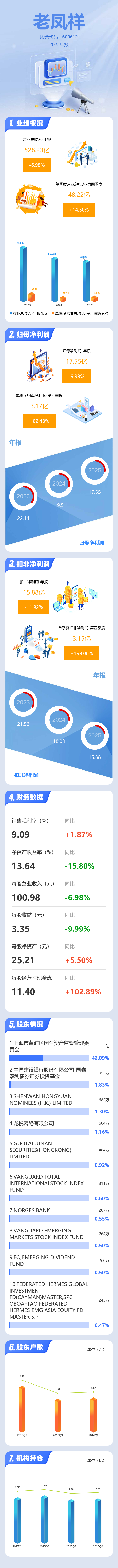 证券之星消息,老凤祥2025年年报显示,当年度公司主营收入528.23亿元,同比下降6.99%;归母净利润17.55亿元,同比下降9.99%;扣非净利润15.88亿元,同比下降11.92%;其中2025年第四季度,公司单季度主营收入48.22亿元,同比上升14.5%;单季度归母净利润3.17亿元,同比上升82.49%;单季度扣非净利润3.15亿元,同比上升199.07%;负债率25.1%,投资收益-8813.21万元,财务费用1.72亿元,毛利率9.09%。