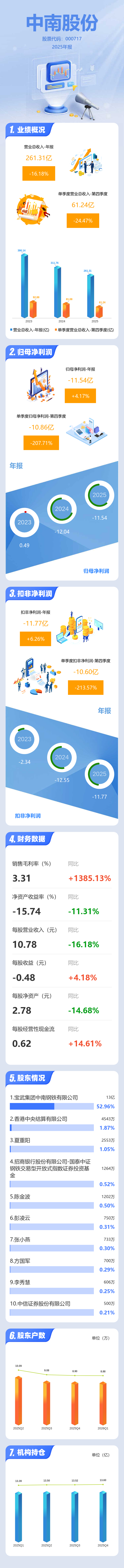 证券之星消息,中南股份2025年年报显示,当年度公司主营收入261.31亿元,同比下降16.18%;归母净利润-11.54亿元,同比上升4.17%;扣非净利润-11.77亿元,同比上升6.26%;其中2025年第四季度,公司单季度主营收入61.24亿元,同比下降24.47%;单季度归母净利润-10.86亿元,同比下降207.71%;单季度扣非净利润-10.6亿元,同比下降213.58%;负债率63.41%,投资收益999.43万元,财务费用5984.4万元,毛利率3.31%。