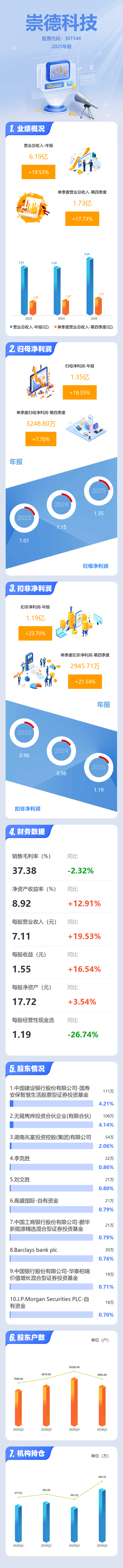 证券之星消息,崇德科技2025年年报显示,当年度公司主营收入6.19亿元,同比上升19.54%;归母净利润1.35亿元,同比上升16.55%;扣非净利润1.19亿元,同比上升23.71%;其中2025年第四季度,公司单季度主营收入1.73亿元,同比上升17.74%;单季度归母净利润3248.8万元,同比上升7.7%;单季度扣非净利润2945.71万元,同比上升21.54%;负债率15.44%,投资收益1188.67万元,财务费用-642.37万元,毛利率37.38%。