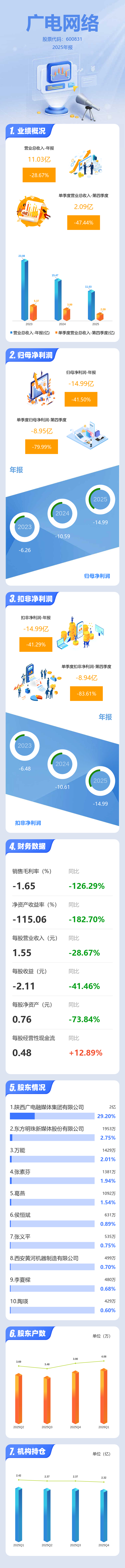 证券之星消息,广电网络2025年年报显示,当年度公司主营收入11.03亿元,同比下降28.68%;归母净利润-14.99亿元,同比下降41.5%;扣非净利润-14.99亿元,同比下降41.3%;其中2025年第四季度,公司单季度主营收入2.09亿元,同比下降47.44%;单季度归母净利润-8.95亿元,同比下降79.99%;单季度扣非净利润-8.94亿元,同比下降83.62%;负债率94.53%,投资收益-1508.68万元,财务费用2.28亿元,毛利率-1.65%。