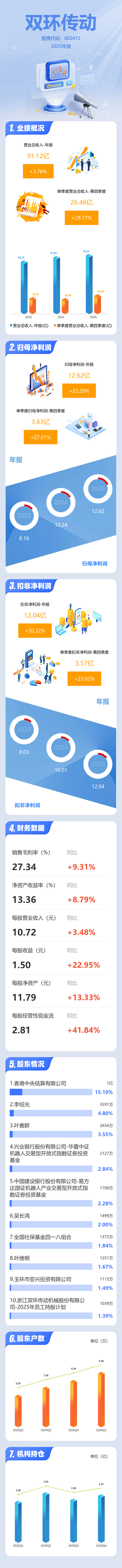 证券之星消息,双环传动2025年年报显示,当年度公司主营收入91.12亿元,同比上升3.77%;归母净利润12.62亿元,同比上升23.21%;扣非净利润12.04亿元,同比上升20.32%;其中2025年第四季度,公司单季度主营收入26.46亿元,同比上升29.77%;单季度归母净利润3.63亿元,同比上升27.02%;单季度扣非净利润3.57亿元,同比上升23.03%;负债率43.98%,投资收益-920.89万元,财务费用4698.59万元,毛利率27.34%。