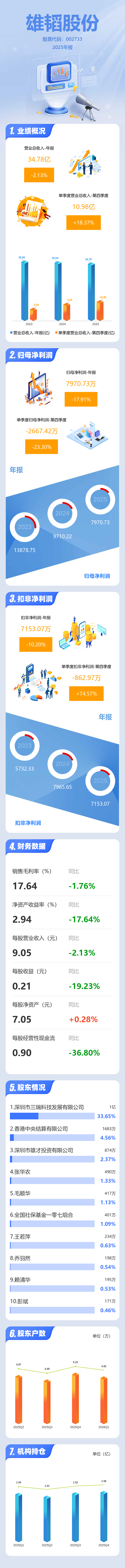 证券之星消息,雄韬股份2025年年报显示,当年度公司主营收入34.78亿元,同比下降2.14%;归母净利润7970.73万元,同比下降17.91%;扣非净利润7153.07万元,同比下降10.2%;其中2025年第四季度,公司单季度主营收入10.98亿元,同比上升18.38%;单季度归母净利润-2667.42万元,同比下降23.3%;单季度扣非净利润-862.97万元,同比上升74.58%;负债率46.1%,投资收益2056.76万元,财务费用2774.18万元,毛利率17.64%。