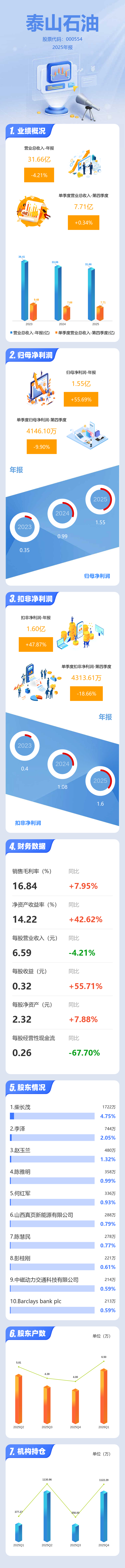 证券之星消息,泰山石油2025年年报显示,当年度公司主营收入31.66亿元,同比下降4.22%;归母净利润1.55亿元,同比上升55.7%;扣非净利润1.6亿元,同比上升47.87%;其中2025年第四季度,公司单季度主营收入7.71亿元,同比上升0.34%;单季度归母净利润4146.1万元,同比下降9.9%;单季度扣非净利润4313.61万元,同比下降18.67%;负债率30.97%,财务费用514.0万元,毛利率16.84%。