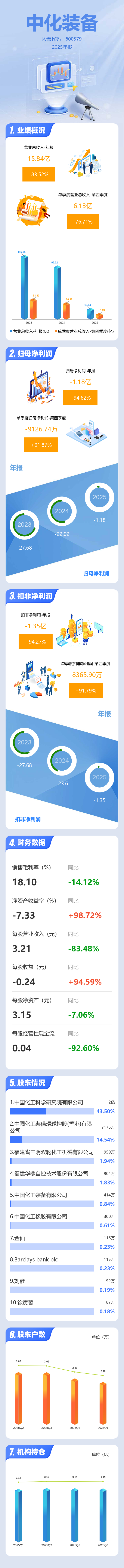 证券之星消息,中化装备2025年年报显示,当年度公司主营收入15.84亿元,同比下降83.52%;归母净利润-1.18亿元,同比上升94.63%;扣非净利润-1.35亿元,同比上升94.28%;其中2025年第四季度,公司单季度主营收入6.13亿元,同比下降76.72%;单季度归母净利润-9126.74万元,同比上升91.87%;单季度扣非净利润-8365.9万元,同比上升91.8%;负债率58.08%,投资收益-4159.4万元,财务费用1147.59万元,毛利率18.1%。