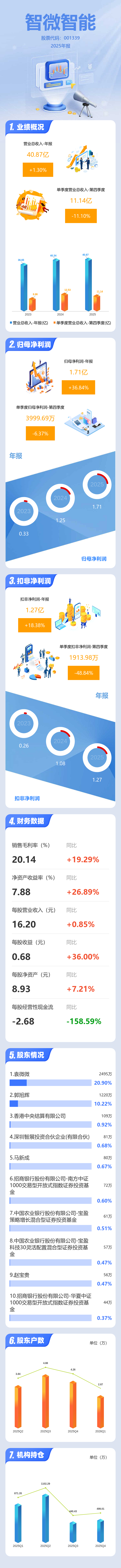 证券之星消息,智微智能2025年年报显示,当年度公司主营收入40.87亿元,同比上升1.3%;归母净利润1.71亿元,同比上升36.84%;扣非净利润1.27亿元,同比上升18.39%;其中2025年第四季度,公司单季度主营收入11.14亿元,同比下降11.1%;单季度归母净利润3999.69万元,同比下降6.38%;单季度扣非净利润1913.98万元,同比下降48.85%;负债率60.27%,投资收益644.32万元,财务费用1994.22万元,毛利率20.14%。