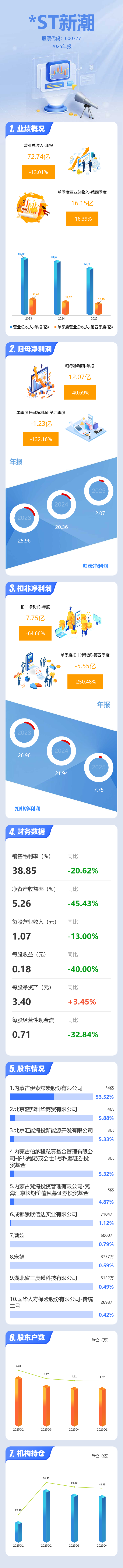 证券之星消息,*ST新潮2025年年报显示,当年度公司主营收入72.74亿元,同比下降13.01%;归母净利润12.07亿元,同比下降40.69%;扣非净利润7.75亿元,同比下降64.67%;其中2025年第四季度,公司单季度主营收入16.15亿元,同比下降16.39%;单季度归母净利润-1.23亿元,同比下降132.16%;单季度扣非净利润-5.55亿元,同比下降250.48%;负债率34.35%,投资收益1.12亿元,财务费用4.51亿元,毛利率38.85%。